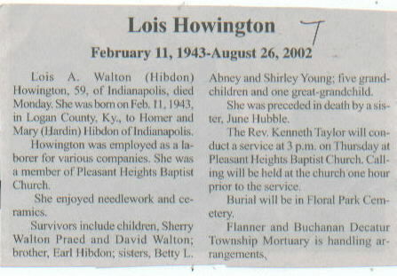| Survived By | Children, Sherry Walton Praed and David Walton; brother, Earl Hibdon; sisters, Betty L. Abney and Shirley Young; 5 grandchildren; 1 great-grandchild. |