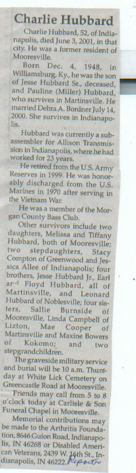 Survived By Mother, Pauline (Miller) Hubbard; spouse; daughters, Melissa and Tiffany Hubbard; brothers, Jesse Hubbard, Jr., Earl, Floyd, and Leonard Hubbard; sisters, Sallie Burnside, Linda Campbell, Mae Cooper, and Maxine Bowers.