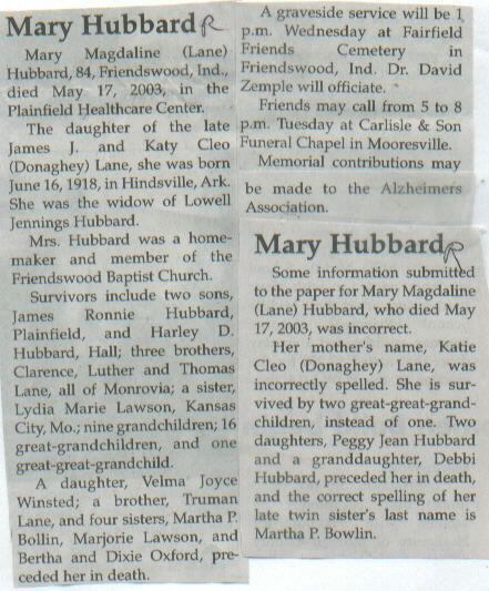 Other Preceded in death by two daughters, Peggy Jean Hubbard and Velma Joyce Winsted; a brother, Truman Lane; four sisters, Martha P. Bowlin, Marjorie Lawson, and Bertha and Dixie Oxford; and a granddaughter, Debbie Hubbard.