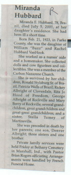 | Other | Preceded in death by parents, William and Rachel Hubbard VanHook; son, Denver Albright; 3 sisters; brother. |
