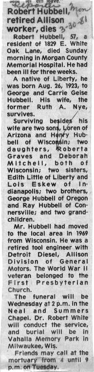 Survived By Wife; sons, Loren and Henry "Hank" Hubbell; daughters, Roberta "Bobbie" Graves and Deborah "Debbie" Mitchell; sisters, Edith Little and Lois Eskew; brothers, George and Ray Hubbell.