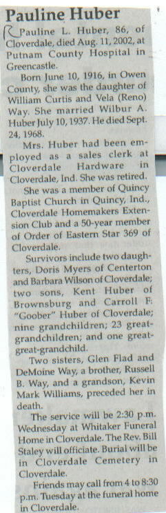 | Survived By | Two daughters, Doris Myers and Barbara Wilson; 2 sons, Kent and Carroll F. "Goober" Huber; 9 grandchildren; 23 great-grandchildren; one great-great-grandchild. |