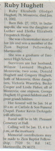 | Survived By | Spouse; 2 sons, Donald and Gregory Hughett; 3 daughters, Victoria Wuertley, Becky Cooper, and Linda Fisher; stepson, George Hughett; 13 grandchildren; 23 great-grandchildren. |