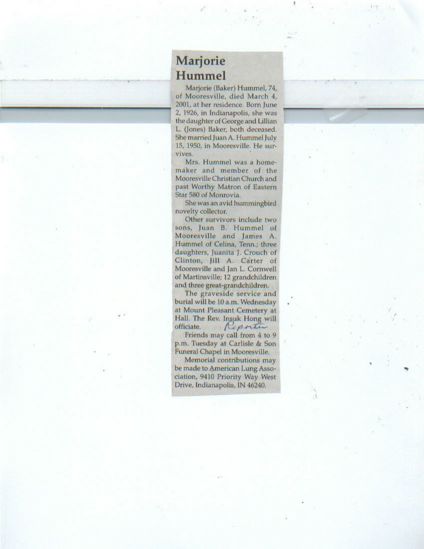 Survived By Spouse; sons, Juan B. and James A. Hummel; daughters, Juanita J. Crouch, Jill A. Carter, and Jan L. Cornwell; 12 grandchildren; 3 great-grandchildren.