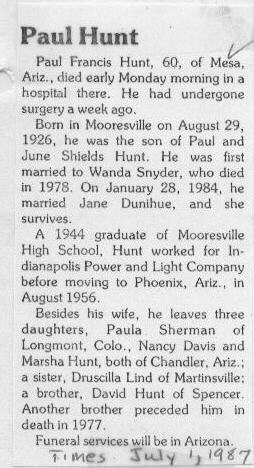 | Survived By | Wife; daughters, Paula Sherman, Nancy Davis, and Marsha Hunt; sister, Drucilla Lind; brother, David Hunt. |