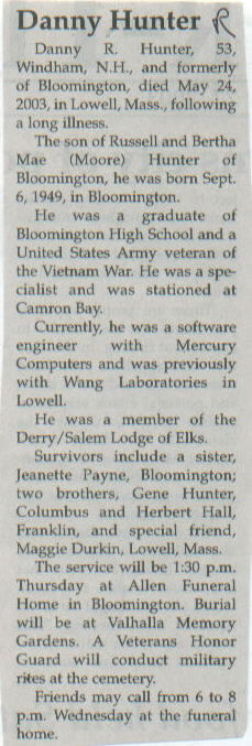 | Other | Age 53. United States Army veteran of the Vietnam War. He was a specialist, stationed at Camron Bay. Parents: Russell and Bertha Mae (Moore) Hunter of Bloomington. |