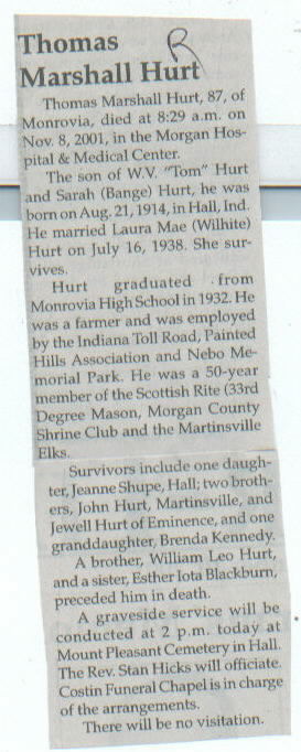 | Other | Age 87. Preceded in death by parents, W. V. and Sarah (Bange) Hurt; brother, William Leo Hurt; sister, Esther Iota Blackburn. |