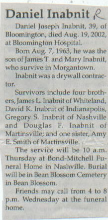 | Survived By | Parents, James T. and Mary Inabnit; 4 brothers, James L., David K., Gregory S., and Douglas F. Inabnit; sister, Amy E. Smith. |