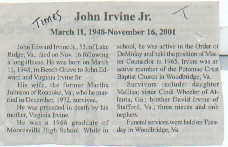 | Other | Age 53. Preceded in death by mother, Virginia Irvine. |