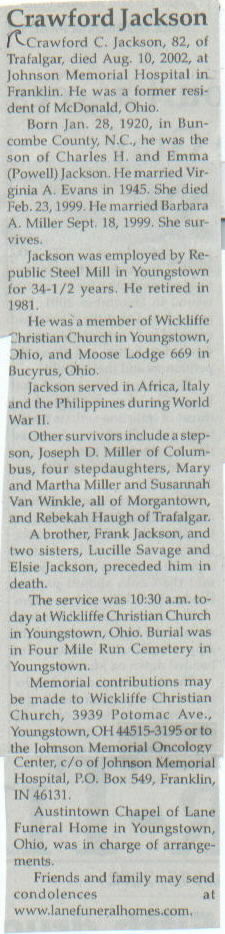 | Other | Age 82. Served in Africa, Italy, and the Philippines during WW II. A brother, Frank Jackson, and two sisters, Lucille Savage and Elsie Jackson, preceded him in death. |