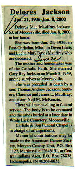 | Survived By | Husband; 2 sons, Gary Ray, Jr. and Erik Steven Jackson; 2 brothers; 1 sister; 3 grandchildren. (A son, Thomas Andrew Jackson, 2 brothers, and a sister are deceased.) |