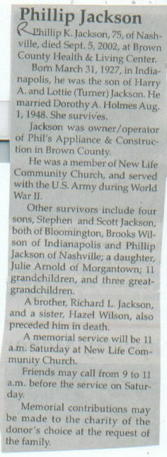 | Survived By | Spouse; 4 sons, Stephen and Scott Jackson, Brooks Wilson, and Phillip Jackson; daughter, Julie Arnold; 11 grandchildren; 3 great-grandchildren. |