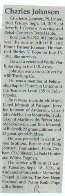 | Other | Preceded in death by parents, Albert R. and Emma (Farmer) Johnson; brothers, Roscoe and Nola Johnson; sisters, Flora Graham, Ola Johnson, LaVada Hunter, and Wilma Fogman. U.S. Army veteran of World War II. |