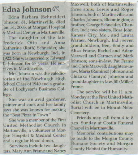 | Survived By | Spouse; 2 daughters, Mary Ann Frame and Nancy Maxwell; 3 sons, Lewis, Roger, and Charles Johnson; brother, George Schneider; 2 sisters, Rosa John and Laura Warner; 7 grandchildren, Ben, Emily and Aliza Frame, Rachel and Adam Maxwell, and Carmen and Mark Johnson; sons-in-law, Pat Frame and Chris Maxwell; daughters-in-law, Maria (Ramirez) Johnson and Chizuko (Tamiya) Johnson; granddaughter-in-law, Jill (Miller) Frame. |