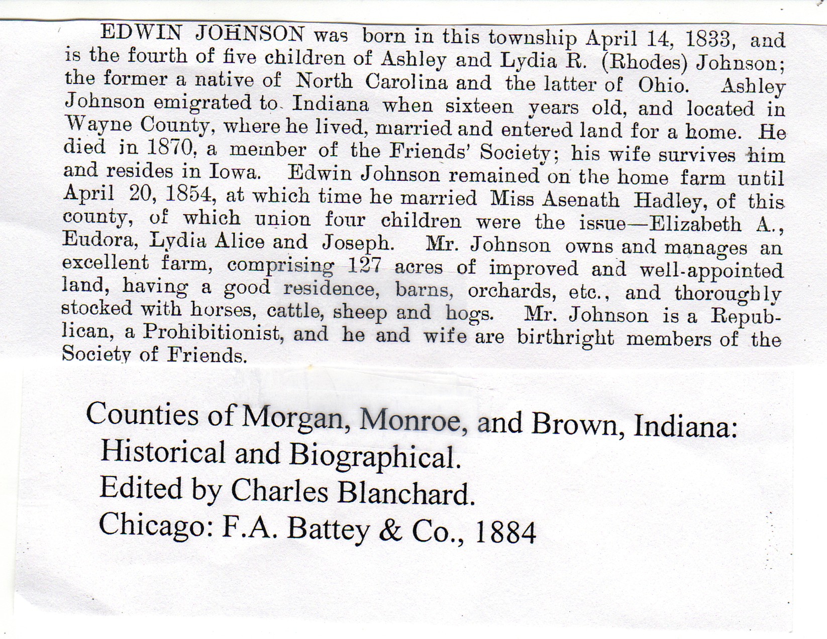 Other Age 85. Born in Morgan Co., Ind. Parents: Ashley and Lydia R. (Rhodes) Johnson. Married on April 20, 1854; they were the parents of 4 children: Elizabeth A., Endora, Lydia A., and Joseph.