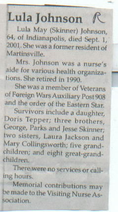 | Survived By | Daughter, Doris Tepper; brothers, George, Parks, and Jesse Skinner; sisters, Laura Jackson and Mary Collingwsworth; 5 grandchildren; 8 great-grandchildren. |