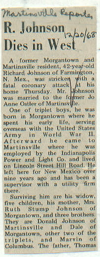 | Survived By | Wife; 5 children; mother, Mrs. Ruth Stump Johnson; brothers, Donald, Dale, and Marvin Johnson. |