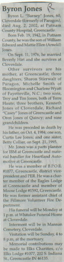 | Survived By | Widow; mother, Mattie Ellen (Arnold) Jones; 3 daughters, Sharon Stierwalt, Michelle Smith, and Charlene Wyatt; 2 sons, Try and Tim Jones; 3 brothers, Kenneth, Richard "Casey," and Oren Jones; 9 grandchildren. |