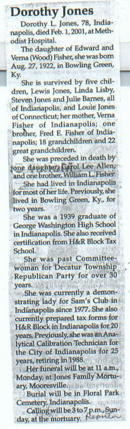 | Survived By | Mother, Verna (Wood) Fisher; children, Lewis Jones, Linda Lisby, Steven Jones, Julie Barnes, and Louie Jones; brother, Fred E. Fisher; 18 grandchildren; 22 great-grandchildren. |