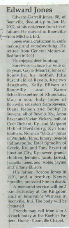 Survived By Widow; mother, Julie Burchfield; 2 daughters, Kelly Ellison and Karen Schaefferkoetter; son, Jody Jones; 6 sisters, Sara Stevens, Diane Nelson, Bobby Jo Stevens, Anna Baker, Vivian Vickers, and Margaret Hall; 4 brothers, Norman "Dickie" Jones, Emery Jones, Estel Spradlin, and Tony Bryant; 7 grandchildren, Jennifer, Jacob, Jarrod, Jeanetta Jones, and Abbie, Jayme and Tiffany Ellison.
