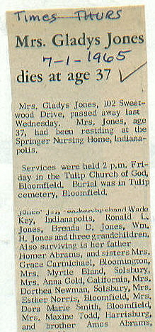 | Survived By | Husband; sons, Ronald L. and William H. Jones; daughters, June Key and Brenda D. Jones; father, Homer Abrams; 7 sisters; brother, Amos Abrams. |