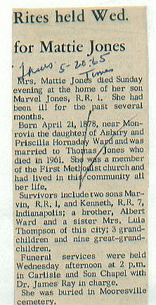 Other Age 86. Born near Monrovia, Morgan Co., Ind.; daughter of Asbury and Priscilla Hornaday Ward. Married on Oct. 22, 1899 in Morgan Co. Mother of 2 sons. "Mattie loved to go into [Mooresville] and stay at the McCracken House (a favorite hotel and restaurant for many years). When she came to town, she got to enjoy a little shopping, get her hair done, or go to a movie. While she was doing this, Tommy was usually at the cattle auction that was held at Franklin and Main Street."