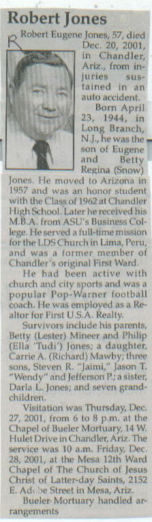| Survived By | Parents, Betty (Lester) Mineer and Philip (Ella "Tudi") Jones; daughter, Carrie A. (Richard) Mawby; 3 sons, Steven R. "Jaimi", Jason T. "Wendy", and Jefferson P.; sister, Darla L. Jones; 7 grandchildren. |