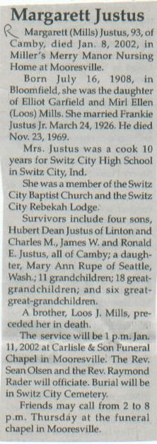 | Survived By | Four sons, Hubert Dean, Charles M., James W., and Ronald E. Justus; daughter, Mary Ann Rupe; 11 grandchildren; 18 great-grandchildren; 6 great-great-grandchildren. |