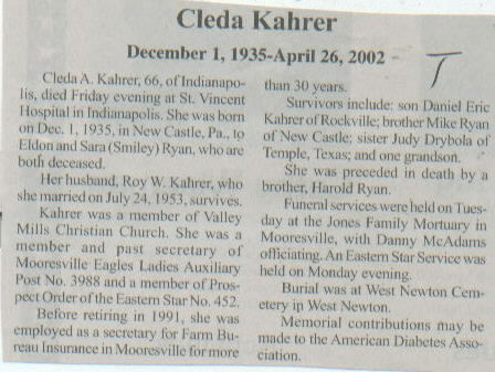 | Survived By | Spouse; son, Daniel Eric Kahrer; brother, Mike Ryan; sister, Judy Drybola; one grandson. |