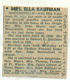 | Survived By | Daughters, Mrs. John (Jennie) Moore, Mrs. Thomas Farmer, Mrs. Oakie Larson, Mrs. John Billings, and Mrs. George Daugherty; son, Jesse Kaufman. |