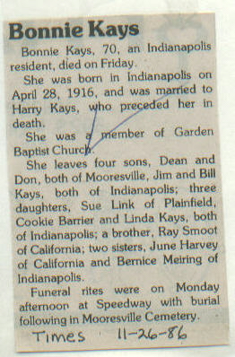 Survived By Sons, Dean, Don, Jim, and Bill Kays; daughters, Sue Link, Cookie Barrier, and Linda Kays; brother, Ray Smoot; sisters, June Harvey and Bernice Meiring.