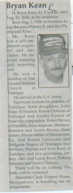 | Survived By | Parents, Henry E. and Ida (Thompson) Kean; 3 daughters, Julie Hope, Karen Chittum, and Ashley Lunter; companion, Robin Brown; 3 stepsons, Matthew, Brandon, and Austin Brown; sisters, Rhoda Miller and Ronda Lancaster; 2 brothers, Dayton and Scott Kean; 5 grandsons, Jordan, Alex, and Lucas Kean, Dakota Schelske, and Justin Chittum. |