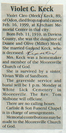 Other Age 89. Carlisle Graveside services and burial at White Lick cemetery. Parents: Duane and Olive Miller Meek. Died at Odon, Ind.; born in Daviess Co. Preceded in death by husband and an adopted daughter, Karen L. Keck.