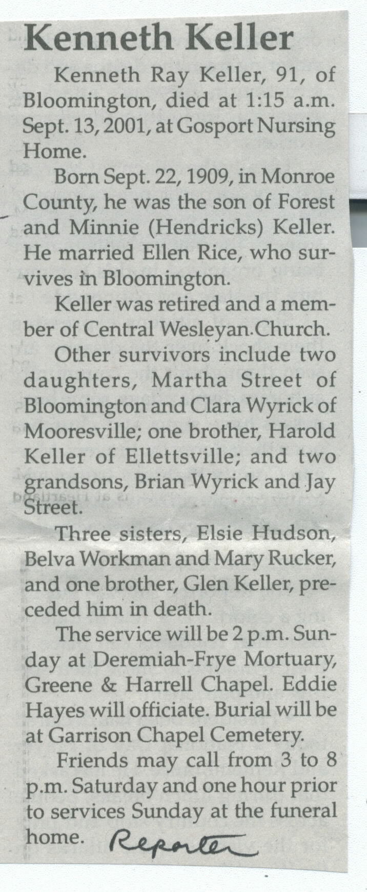 | Other | Preceded in death by parents, Forest and Minnie (Hendricks) Keller; sisters, Elsie Hudson, Belva Workman, and Mary Rucker; brother, Glen Keller. |