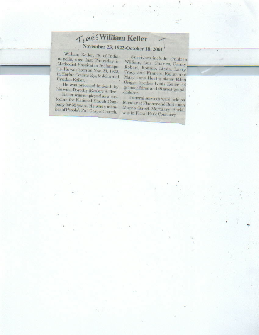 Survived By Children, William, Lois, Charles, Danny, Robert, Ronnie, Linda, Larry, Tracy, and Frances Keller, and Mary Jane Heath; sister, Edna Griggs; brother, Louis Keller; 34 grandchildren; 49 great-grandchildren.