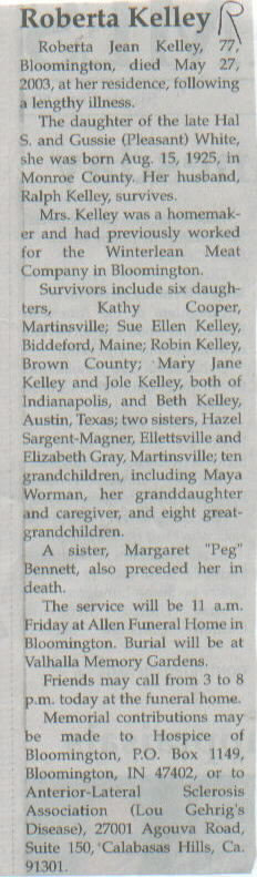 | Other | Daughter of the late Hal S. and Gussie (Pleasant) White. A sister, Margaret "Peg" Bennett, also preceded her in death. |