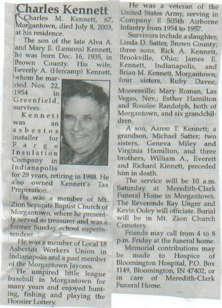 | Other | Veteran of the United States Army, serving in Company E 505th Airborne Infantry from 1954 to 1957. Preceded in death by a son, Aaron T. Kennett; a grandson, Michael Satter; two sisters, Geneva Miley and Virginia Hamilton; and three brothers, William A., Everett, and Richard Kennett. |