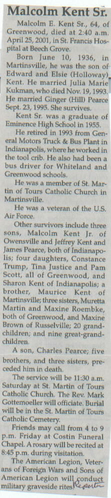 | Survived By | Spouse, Ginger (Pearce) Kent; sons, Malcolm Kent, Jr., Jeffrey Kent, and James Pearce; daughters, Constance Trump, Tina Justice, Pam Scott, and Sharon Kent; brother, Maurice Kent; sisters, Muretta Martin, Maxine Roembke, and Maxine Brown; 20 grandchildren; 9 great-grandchildren. |