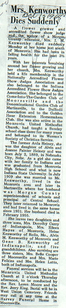 | Other | Age 80. Daughter of Alvin and Joanna Painter Heiney. Died suddenly after failing in health. Harvey funeral at Monrovia United Methodist Church. Buried West Union Friends cemetery at Monrovia. Flower grower and accredited show judge. Graduate Monrovia HS and Indiana State U. Husband was Supt. of schools and principal. |