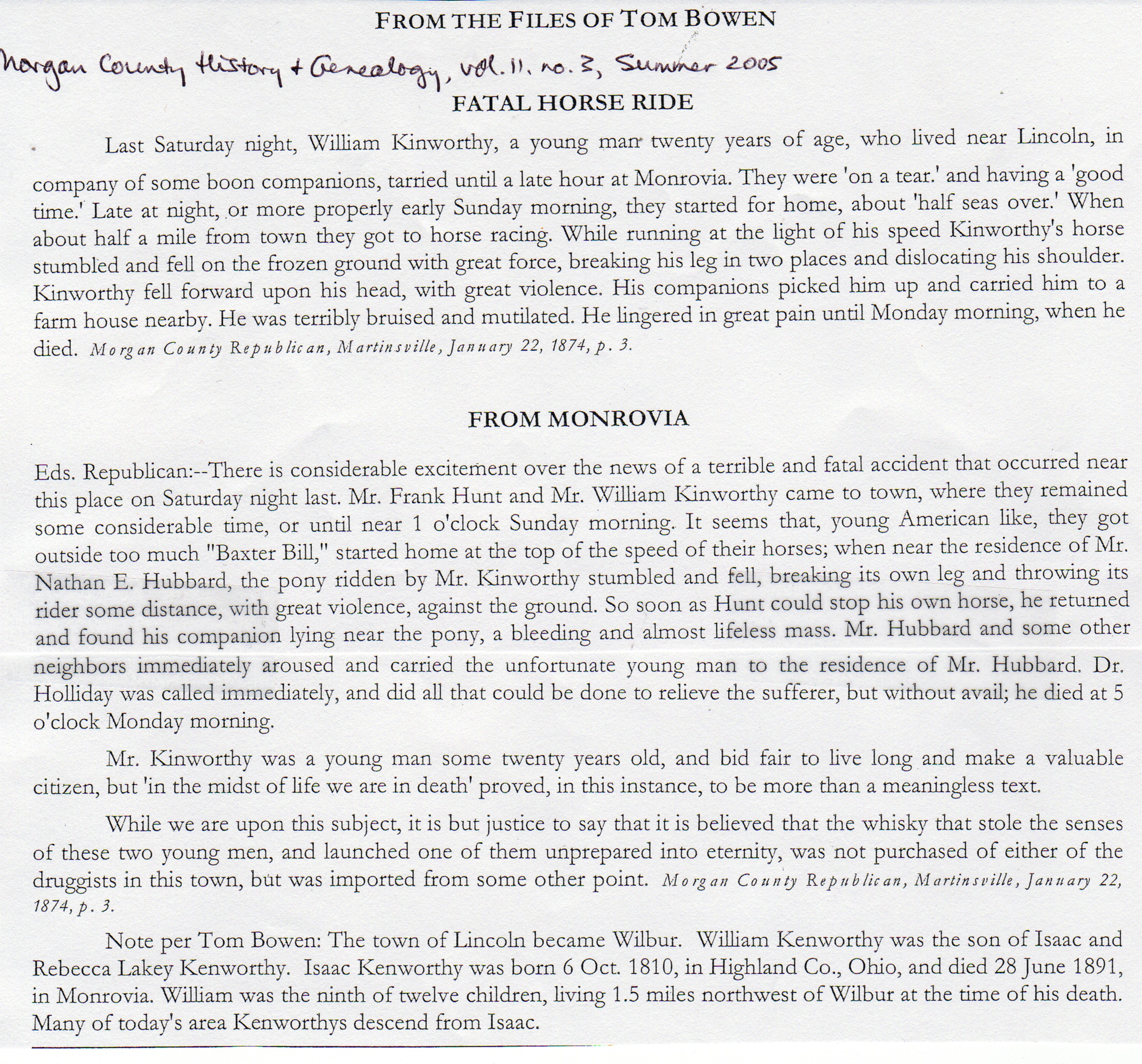 | Other | Age 19 years and 10 months. "From Monrovia -- William Kenworthy, age about 20, was thrown from his horse, on his return home from Monrovia, and died Monday last. He had been drinking in town with Frank Hunt." Son of Isaac and Rebecca Lakey Kenworthy. |