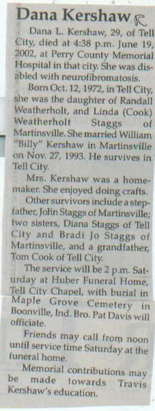 | Survived By | Spouse; stepfather, John Staggs; 2 sisters, Diana and Bradi Jo Staggs; grandfather, Tom Cook; parents, Randall Weatherholt and Linda (Cook) Weatherholt Staggs. |