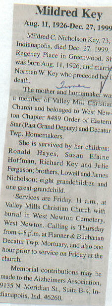 | Survived By | Children, Ronald Hayes, Susan Elaine Hoffman, Richard Key, and Julie Ferguson; brothers, Lowell and James Nicholson; 8 grandchildren; 1 great-grandchild. |