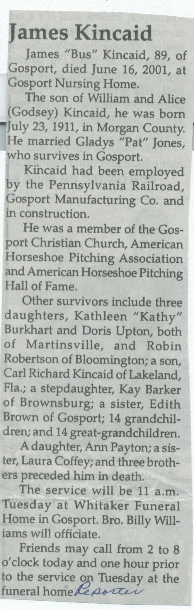 | Other | Preceded in death by parents, William and Alice (Godsey) Kincaid; daughter, Ann Payton; sister, Laura Coffey; 3 brothers. |