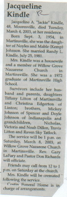 | Survived By | Spouse; parents, Noyles and Mable (Kemp) Johnson; daughters, Tiffany Litton and Christina Edgerton; brothers, Mickey and Doyle Johnson; grandchildren, Nicholas, Victoria, and Noah Dillon, Travis Litton, and Raven Sky Tatlock. |
