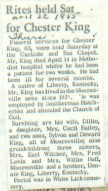 | Survived By | Wife; daughter, Mrs. Cecil Bailey; sons, Sylvan and Dewar King; sisters, Mrs. Earl Wilcher, Mrs. Fred Levin, and Mrs. Willie Huff; brother, Dennie King. |