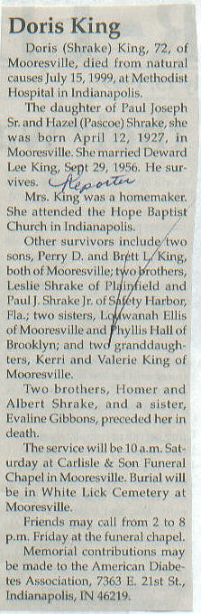 | Survived By | 2 sons, Perry D. and Brett L. King; 2 brothers, Leslie and Paul J. Shrake; 2 sisters, Louwanah Ellis and Phyllis Hall; 2 grandchildren, Kerri and Valerie King of Mooresville. |