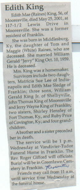 | Survived By | Daughters, Matricia Sue Lee and Edith Mae Sledge; sons, William Gerald King, Jr., John Thomas, and Jerry Wayne King; sisters, Shirley Hensley and Ruby Price; 4 grandchildren. |