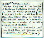 | Survived By | Mooresville relatives: William King, Elma Shrake, Rose Cox, and Mrs. William Anders. |