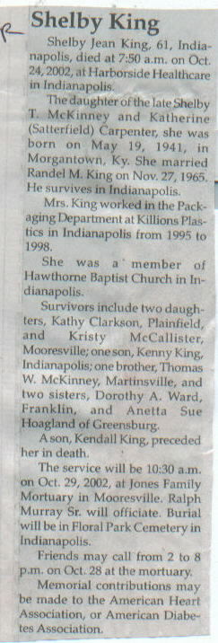 | Survived By | Spouse; 2 daughters, Kathy Clarkson and Kristy McCallister; one son, Kenny King; one brother, Thomas W. McKinney; 2 sisters, Dorothy A. Ward and Anetta Sue Hoagland. |
