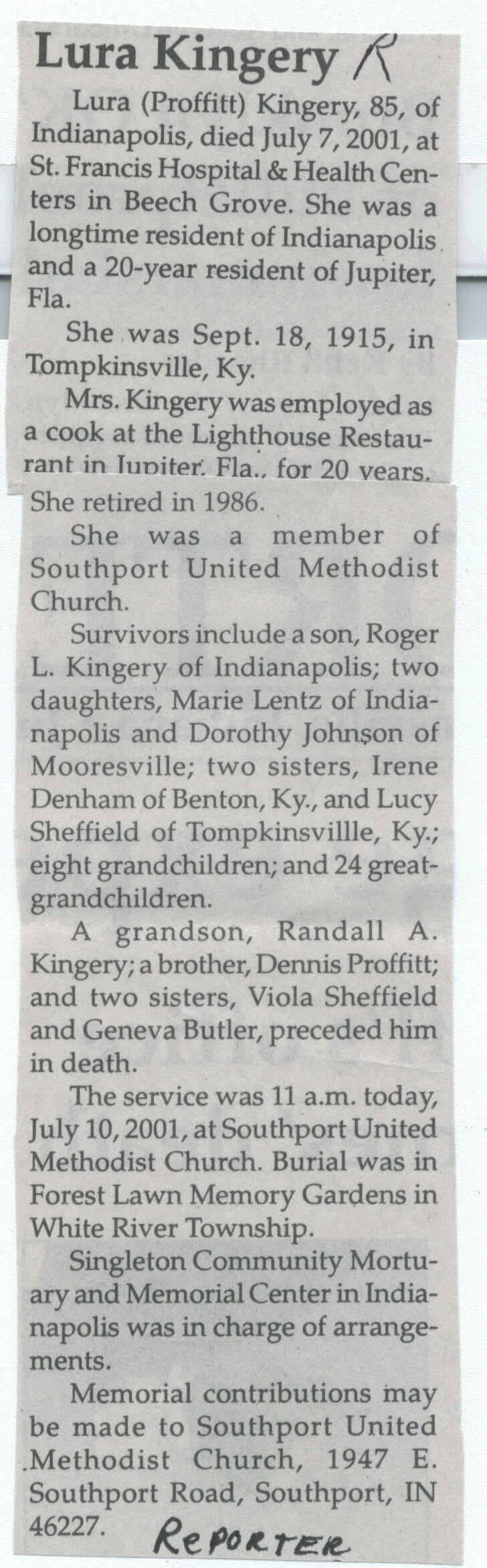 | Other | Preceded in death by a brother, Dennis Proffitt; sisters, Viola Sheffield and Geneva Butler; grandson, Randall A. Kingery. |